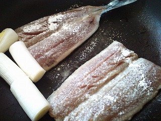 3.フライパンを熱して油をいれ、1の秋刀魚に小麦粉をつけて皮目から焼きます。