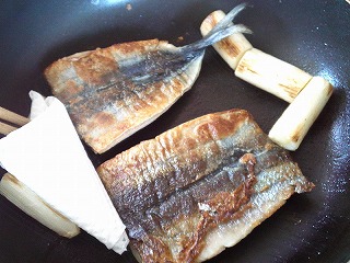 4.秋刀魚とネギを端に寄せて、キッチンペーパーで、油と脂分を拭き取ります。