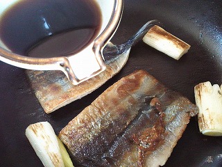 長ねぎを加えて一緒に焼き、色よく焼けたら秋刀魚を裏返し、長ネギは転がして焼きます。