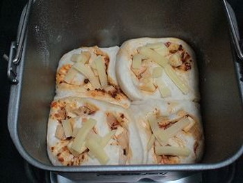 8.発酵後、ピザ用チーズをトッピングして(写真右)、ホームベーカリーのメニュー【14 焼き】25分を選択して焼きました。
