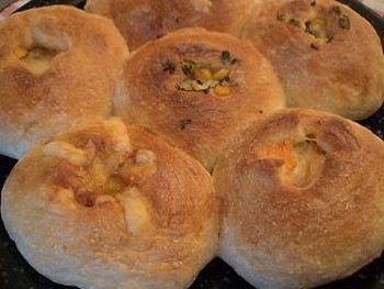 上の写真の【かぼちゃとミートソース】など包んだパンは、我が家のオーブンの天板が小さく、くっつき 「押しくら(?)まんじゅう」 状態に発酵、焼き上がりましたが、これまた外側は香ばしく、中はモチッと美味しかったです!!