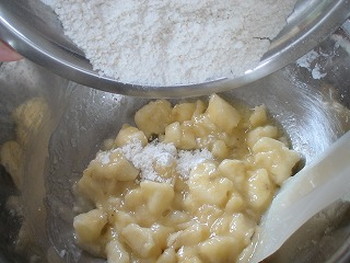 3.1のボウルに2のバター、砂糖を加えて良く混ぜて、白っぽくなったら薄力粉を加えさっくり混ぜ合わせます。