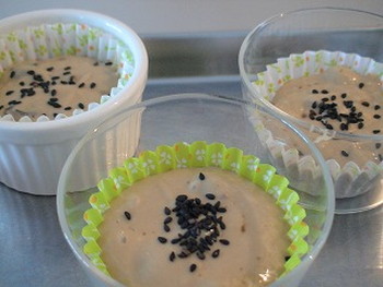 3. 型に流しいれたら黒ごまをふり、蒸し器に入れ強火で12~15分蒸す。蒸しあがりは竹串を刺してチェック!何もついてこなければOKです。