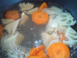 (ニンジン、レンコン、たけのこの順で、私は3分ほどだけ下茹でしました)