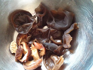 2.きくらげ、干し椎茸は水でもどして千切りします。