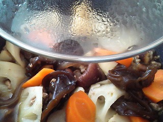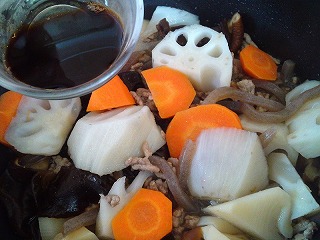 肉に火が通ったら、1のれんこん、にんじん、たけのこを加えます。