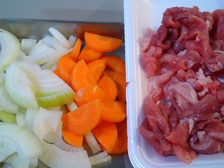 1.たまねぎは薄切りに、にんじんは半月切りにします。マッシュルームは缶から出しておきます。