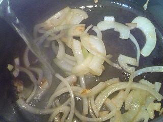 .鍋に油を熱し、たまねぎを炒め、きつね色になるまで炒めます。