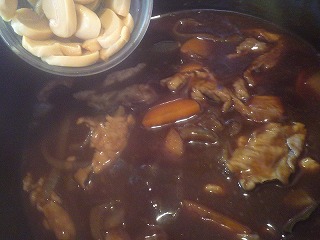 (写真右:玉ねぎをキツネ色にまで待ちきれず、水を加えました)