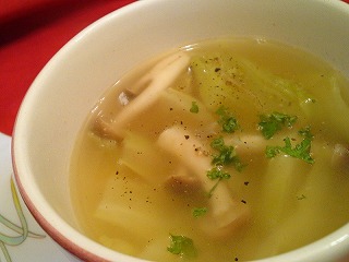 3.2の鍋にコンソメスープ(300㏄)を入れて煮立ったら弱火にし、野菜のあくをとりながら柔らかくなるまで煮ます。