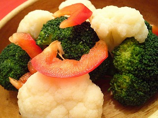 1.カリフラワー(80g)とブロッコリー(100g)は、小房に分けてさっと茹でます。
