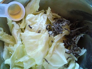 ●私は、キャベツ(生)にごま油、塩こんぶを混ぜ合わせたものを添えました。