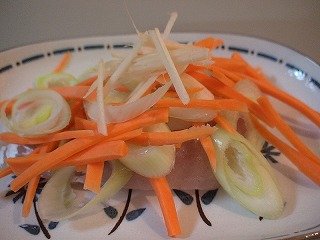 2.耐熱皿にさわら、長ネギ、ニンジン、ショウガをちらします。