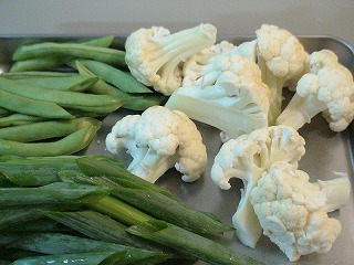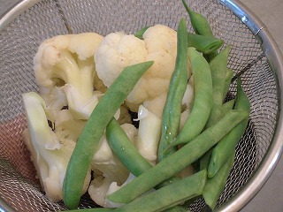 ●写真右:いんげん、カリフラワーを私は、軽く下茹でしました。