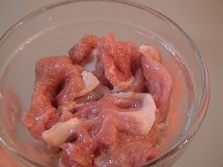 2.豚肉は大きければ3cm幅に切り、(A)の酒(小1)、しょうゆ(小1/2)、片栗粉(小1)、サラ
