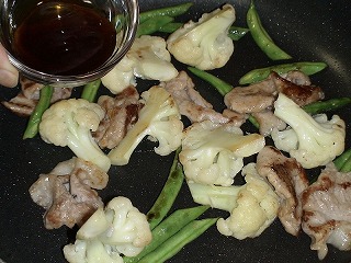 4.肉に火が通ったら、アスパラガス、カリフラワー、酒(小2)を加え、汁けをとばしながら全体に火を通します。
