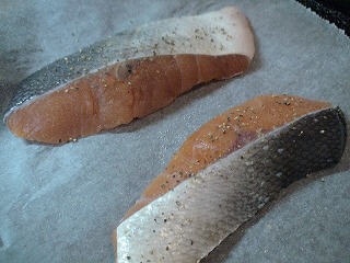 1.鮭に塩・コショウをふり、オーブントースターで10分ほど焼きます。