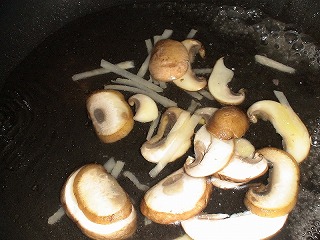 3.フライパンに油をひき、ショウガを炒め、香りが出てきたらマッシュルームを加えて炒め、中華スープを流し入れます。