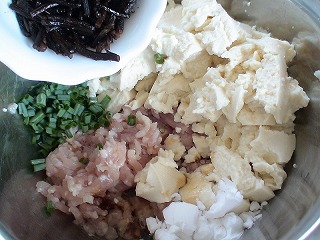 1.ボウルにひき肉、水切りした豆腐、戻したひじき、卵、万能ねぎ、醤油、片栗粉を入れます。よく混ぜ合わせます。