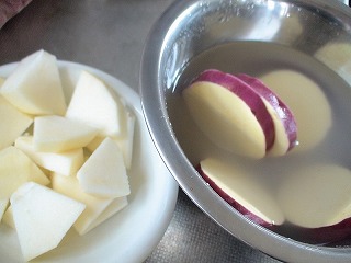 1.サツマイモは皮つきのまま1cmくらいの輪切りにし水にさらします。