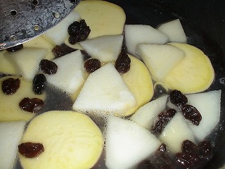 2.鍋に1、レーズン、砂糖、バター、ひたひたよりやや少なめの水を加え、落としぶたをして弱火で煮ます。