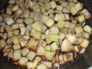 2.フライパンにオリーブ油をひき、ニンニクを炒めます。香りが立ってきたら、セロリ、タマネギを入れて炒めます。