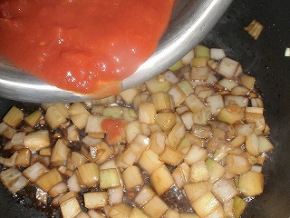 4.ホールトマトを潰して加え、バジル、コショウで味を調えて【野菜ソース】の出来上がり