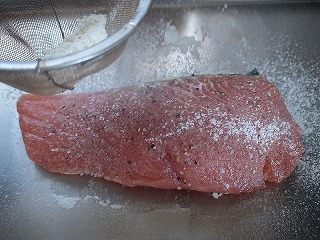1.鮭に塩・コショウを振り、小麦粉を薄くまぶします。