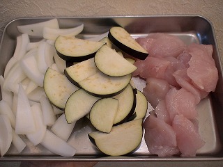 ナス、玉ねぎは食べやすい大きさに切ります。アボカドは半月切りにします。
