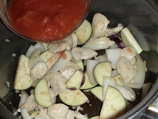 3.香りが出てきたら玉ねぎを加え、しんなりしてきたらナス、ホールトマトを入れます。