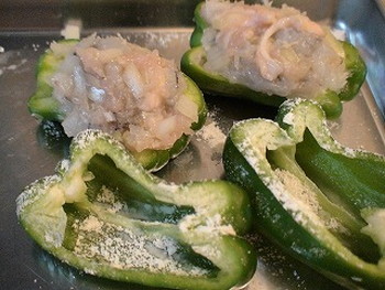 6.1のピーマンの内側に小麦粉を茶こしでまぶし、5の肉ダネを詰める(写真右)
