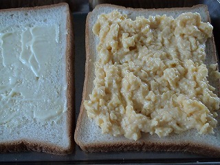 3のスクランブルエッグをのせて広げ、パンを重ねてサンドイッチにします。