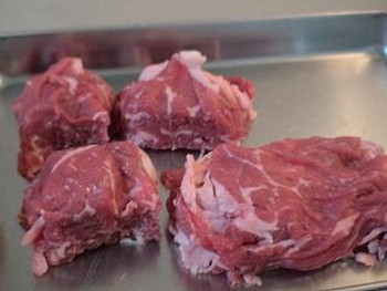 1.薄切り肉を重ねて(ミルフィーユのように)、2~3cm幅に切り、塊肉(ブロック)のようにします。表面(片面)に塩、こしょうします。