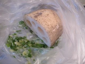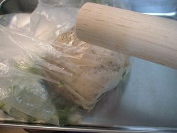 2.1のポリ袋へ、切っていない丸ごとのレンコン(皮つきのまま)を入れて、麺棒で袋の上からレンコンを叩き潰します。