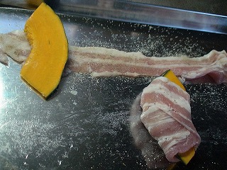 1.カボチャ1/8を12等分に切る。豚バラ肉に、塩・コショウ・鶏がらスープの素を振り、下味をつける。