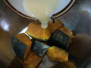 1.カボチャの種を取って部分的に皮をむき、3センチ角に切る。耐熱ボウルに入れふんわりとラップをし、4分程レンジにかける。
