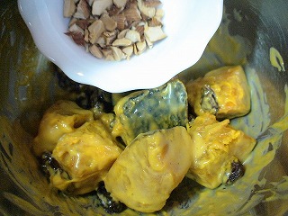 3.1のカボチャをつぶし、2のソース、レーズン、アーモンドを加え混ぜ合わせて【カボチャサラダ】の出来上がり