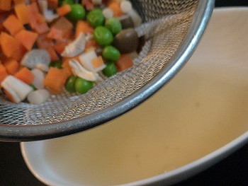 1.お湯に 「ほんだし」を入れて沸騰させ、ニンジン、シイタケを角切りにし、グリーンピースを茹でて、野菜と煮汁に分けておく。(しめじを使用してます)