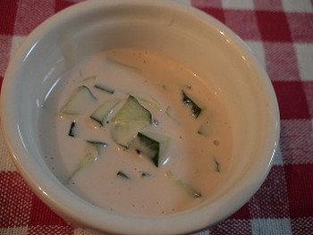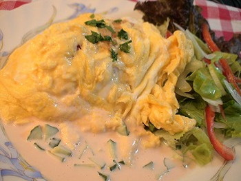 オムレツのトッピングソースが、ケチャップじゃないところが目新しい!シャキシャキきゅうりの食感がいいマヨネーズのソースで、付け合わせのサラダにも合って、美味しかったです!
