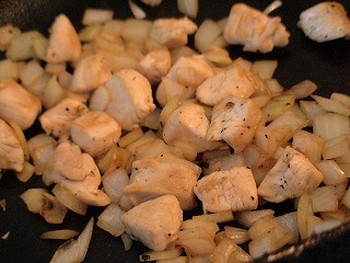 3.2の鶏肉をフライパンで焼き、火が通ったら粗みじんに切ったタマネギ、サラダ油、塩、コショウを加えて、タマネギが透き通ってくるくらいまで炒める。