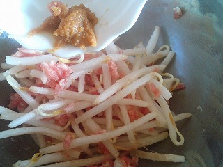 4.ボウルに合わせ調味料のみそ・しょうゆ・砂糖・おろしニンニク・ごま油・豆板醤・鶏がらスープの素を入れよく混ぜ、水を少しずつ加え、みそを溶きます。
