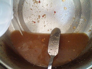 (写真右:私の場合は、この後で使う小鍋に直接、合わせ調味料を入れ混ぜました)