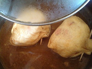 1.油揚げをぬるま湯で揉み洗いし、水気をよく絞り半分に切って袋状に開いておきます。