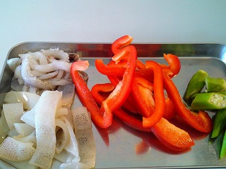 1.イカはワタと胴・ゲソに分け、胴部分は1.5cm幅に、ゲソ部分は2本ずつに切り分けます。(長いゲソは半分の長さに切り分ける。)