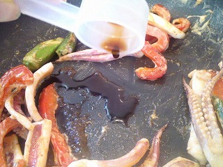 5.さらに真ん中を空けてしょうゆを加え、焦がししょうゆにして全体と混ぜ合わせます。