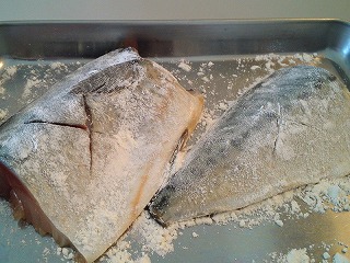 1.サバは水で洗いして水気をふき、半身をそれぞれ半分に切って皮の部分に切り目を入れ、小麦粉を皮目の部分のみ薄くまぶしておきます。