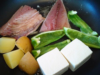 (右写真:私は、アスパラに代わってピーマン。焼き豆腐に代わって絹豆腐を使用。この段階から入れて焼いてみました)