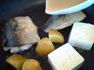 4.アスパラを取り出し、サバを返して2の合わせ調味料を加え、煮立ったら焼き豆腐を加えて2~3分ほど、(煮汁が2/3程度になるまで)煮込みます。