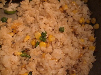 5.4を炊き上がったご飯に混ぜる(写真右)。トウモロコシは、トッピング用に少々残す。