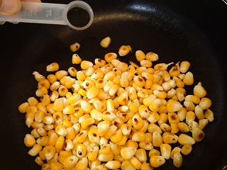 1.とうもろこしの実を外し(生のまま)、フライパンに加え、強火で3分焼きつけます。